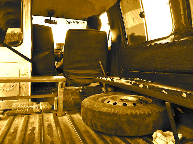Sometimes I take an angkot to work. They are these little buses that drive around on different routes and stop to pick up anyone who needs a ride on the side of the road. It costs a mere 2000 rupiah which is about twenty five cents. They are cheap, convenient and absolutely terrifying if you get the driver I got yesterday. My first red flag was when he nearly ran over a motorcyclist as he pulled over to pick me up. I got in anyway because I needed to get to work. This is when I took this picture of the inside to show you. The driver, who sported a faux hawk and hand tattoos, proceeded to swerve in and out of traffic like an absolute maniac, sniffing the entire time like he had just snorted a bunch of cocaine. As we were driving along a main road WAY TOO FAST, he completely sideswiped a guy on his motorbike. BAM! The guy went flying, the bike skidded on the road, I shrieked and the psychotic driver glanced back, kept on sniffing and sped up. Then he really put the pedal to the metal and kept continuously glancing in his rear view mirror to see a.) if anyone was following him and b.) if I was memorizing his face (at least that's what I assumed he was doing and yes, I was memorizing his face). I had this fear he wasn't going to let me out of the bus and I was relieved when he picked up a few old ladies but didn't even give them time to sit down before he sped off again like a lunatic. All the old ladies toppled onto one another like dominos. I got out as soon as I saw my work building. The horrible thing is no one does anything about it! No calls to the police, no chases after the guy. MENTAL.